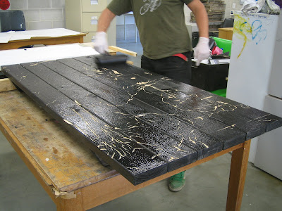 One of the tables is to be carved on site, allowing the opportunity to interact with the general public and extend the project via discussion. Viewers are invited to add their initials or names to the surfaces of the tables.